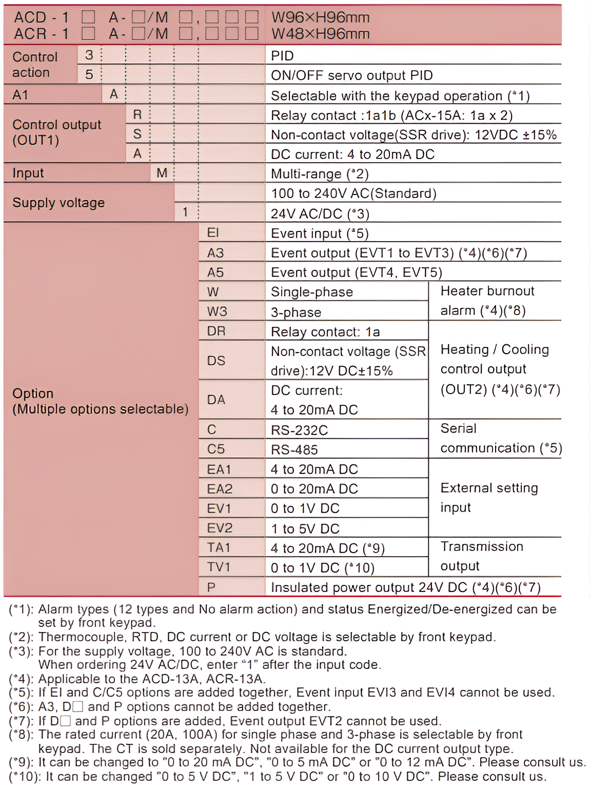 Dòng ACD/ACR hỗ trợ nhiều tùy chọn ngõ ra theo cấu hình đặt hàng, gồm relay contact, SSR drive và một số option mở rộng liên quan tới transmission hoặc event output. Tùy cấu hình, controller có thể dùng cho các bài toán điều khiển nhiệt thông thường hoặc các hệ thống có nhu cầu tích hợp cảnh báo và tín hiệu phụ trợ.