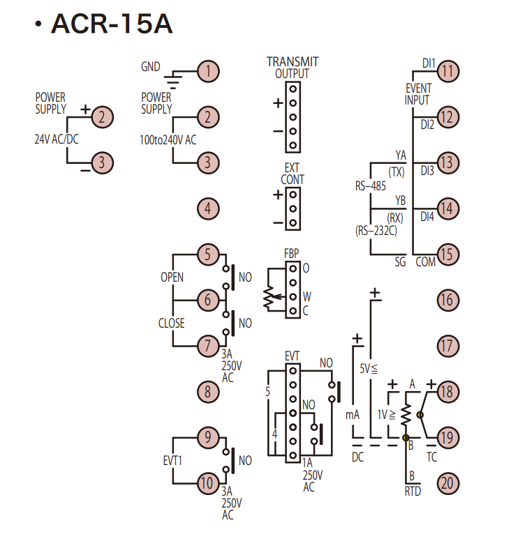 ACR-15A hỗ trợ Event input tối đa 4 điểm dưới dạng option và Event output tối đa 5 điểm. Các chức năng có thể chọn gồm alarm output, heater burnout alarm output, loop break alarm output, timer output, time signal output, pattern end output và các chức năng liên quan khác. Đây là nhóm tính năng giúp thiết bị phù hợp hơn cho các hệ thống cần giám sát, cảnh báo và liên động nhiều hơn controller cơ bản.