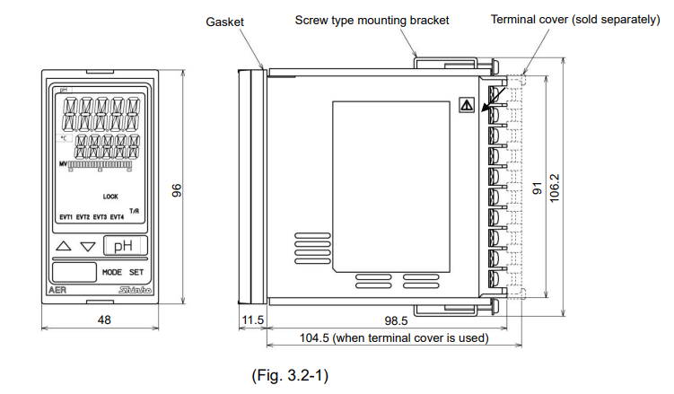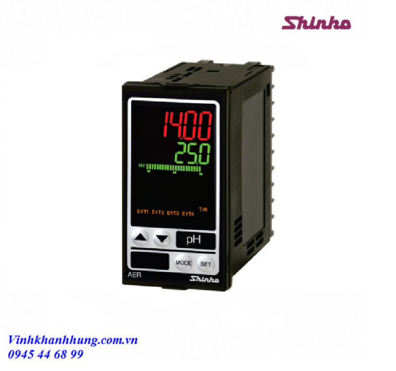 Thiết bị quản lý chất lượng nước Shinko AER-102-PH đo pH và nhiệt độ, lắp tủ 48×96 mm, IP66, hỗ trợ RS-485, phù hợp hệ thống xử lý nước.