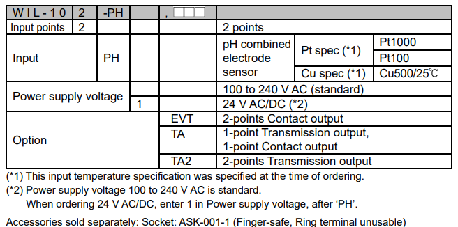 Theo spec sheet, WIL-102-PH có tùy chọn transmission output dạng 4–20 mA DC, với các cấu hình 1 ngõ ra truyền + 1 tiếp điểm hoặc 2 ngõ ra truyền. Ngõ ra này cho phép truyền tín hiệu pH hoặc nhiệt độ về PLC, recorder hoặc hệ thống SCADA để giám sát và lưu dữ liệu vận hành từ xa.