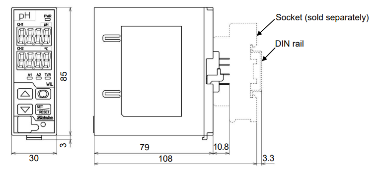 - Kích thước tiêu chuẩn 30 × 88 × 108 mm, dạng cắm đế gắn DIN rail